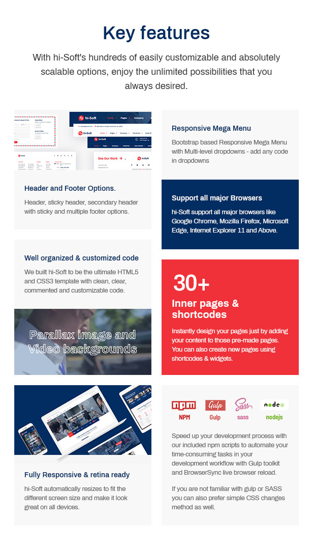 With hi-Soft, you can showcase your work in modern and elegant style. Based on in-depth research, we have developed this great template to deliver everything you are looking for from a website. It includes every little detail and all necessary pages that you can build your website like a pro. All you need is hi-Soft!